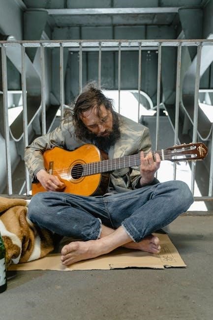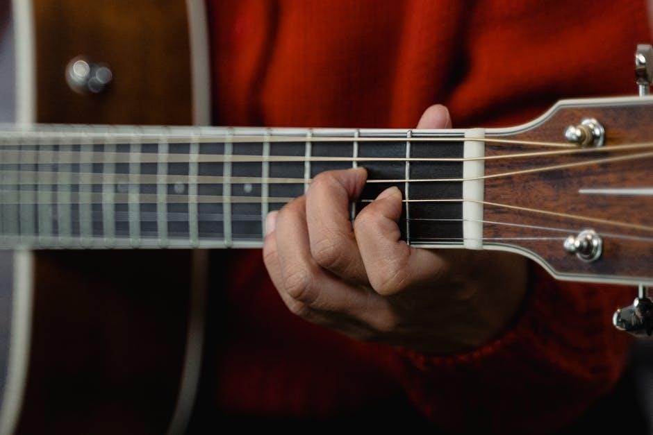 Classical and folk music often utilize timeless chord progressions that evoke emotional depth and storytelling. Classical music frequently employs minor and major scales, with progressions like i-iv-v-i (A minor, D minor, E, A minor) common in sonatas. Folk music, meanwhile, relies on simple, memorable structures, often in major keys, such as I-IV-V-I (C-F-G-C). These progressions are adaptable to guitar, with fingerstyle techniques enhancing their expressive qualities. Many classical and folk pieces use suspended or modal chords (e.g., Csus2, Am7) to add complexity. These progressions are well-documented in guitar PDF guides, making them accessible for study and performance.